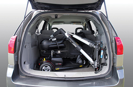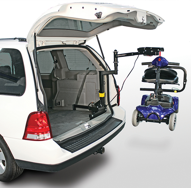 Solve the problem of limited trunk space. Use the economical take-apart Bruno Space-Saver to transport a small scooter or wheelchair lift when your vehicle has limited trunk space or a hatchback. Assemble the lift, connect the docking device, push a button and the Space-Saver automatically lifts your mobility device.